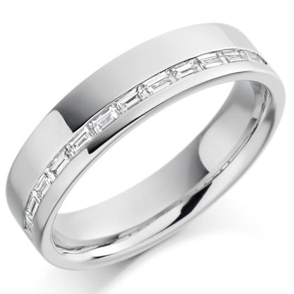 Half set with striking baguette cut diamonds, this band measures 4.9mm in width and is perfect as a bold eternity ring or unusual wedding band.  The sharp lines of the baguette cut diamonds give an eye-catching look, with the smooth contemporary channel setting set off to one side for a stylish finish.  The diamonds in this piece cover approximately 50% of the ring.