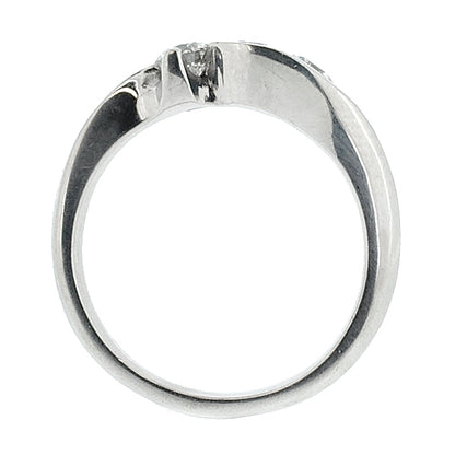 A classic three stone design with, quite literally, a twist.  The crossover design wraps around the three round brilliant cut diamonds forming a combination of claw and rubover settings for the stones.  The diamonds are bright and lively; they are perfectly complemented by the highly polished 18ct white gold setting.  The curving design creates a beautiful shape on the finger.