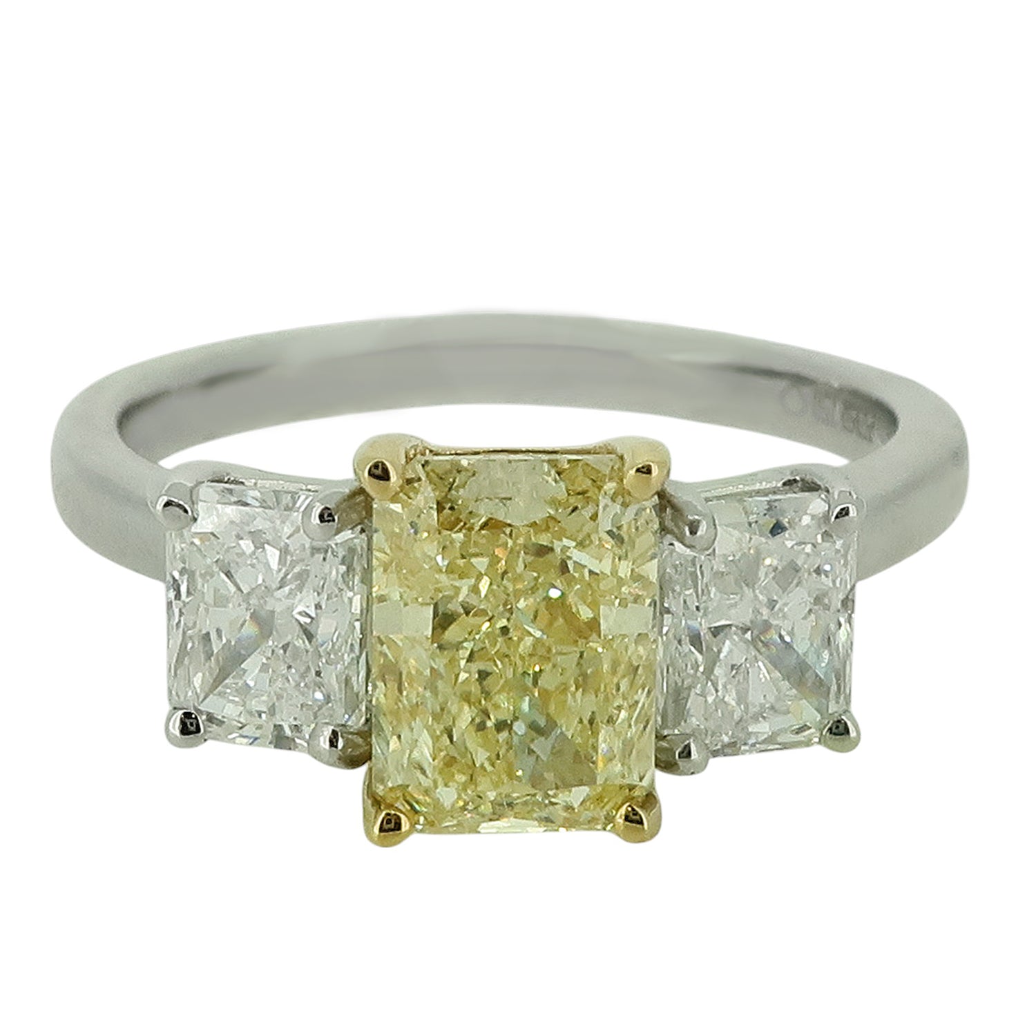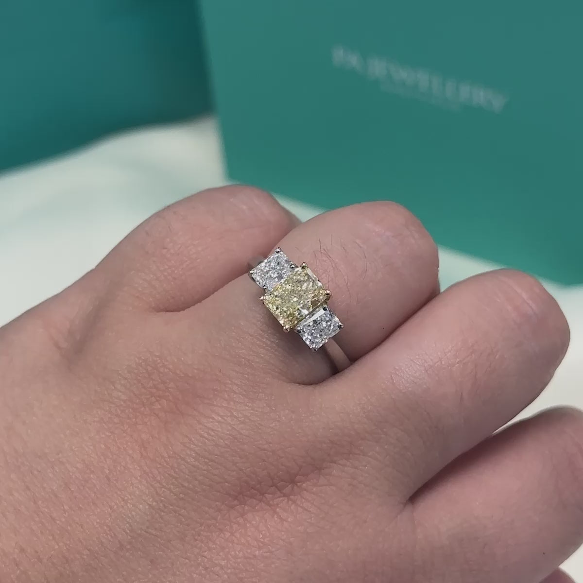 Laboratory Grown Radiant Cut Yellow Diamond Trilogy Ring in Platinum, 2.34ct.