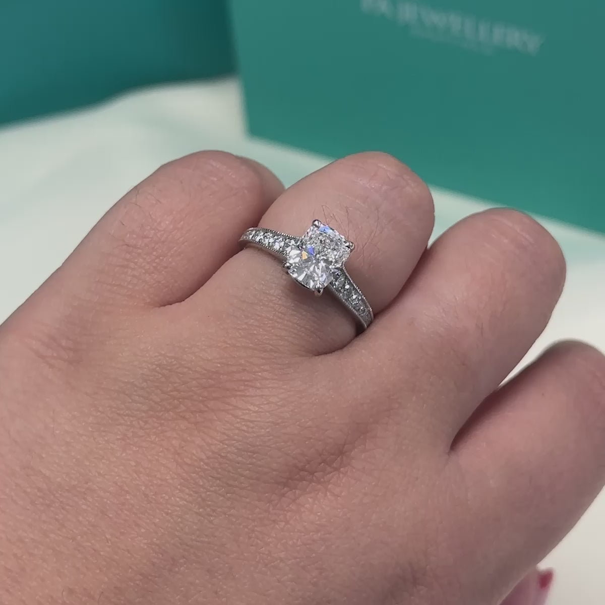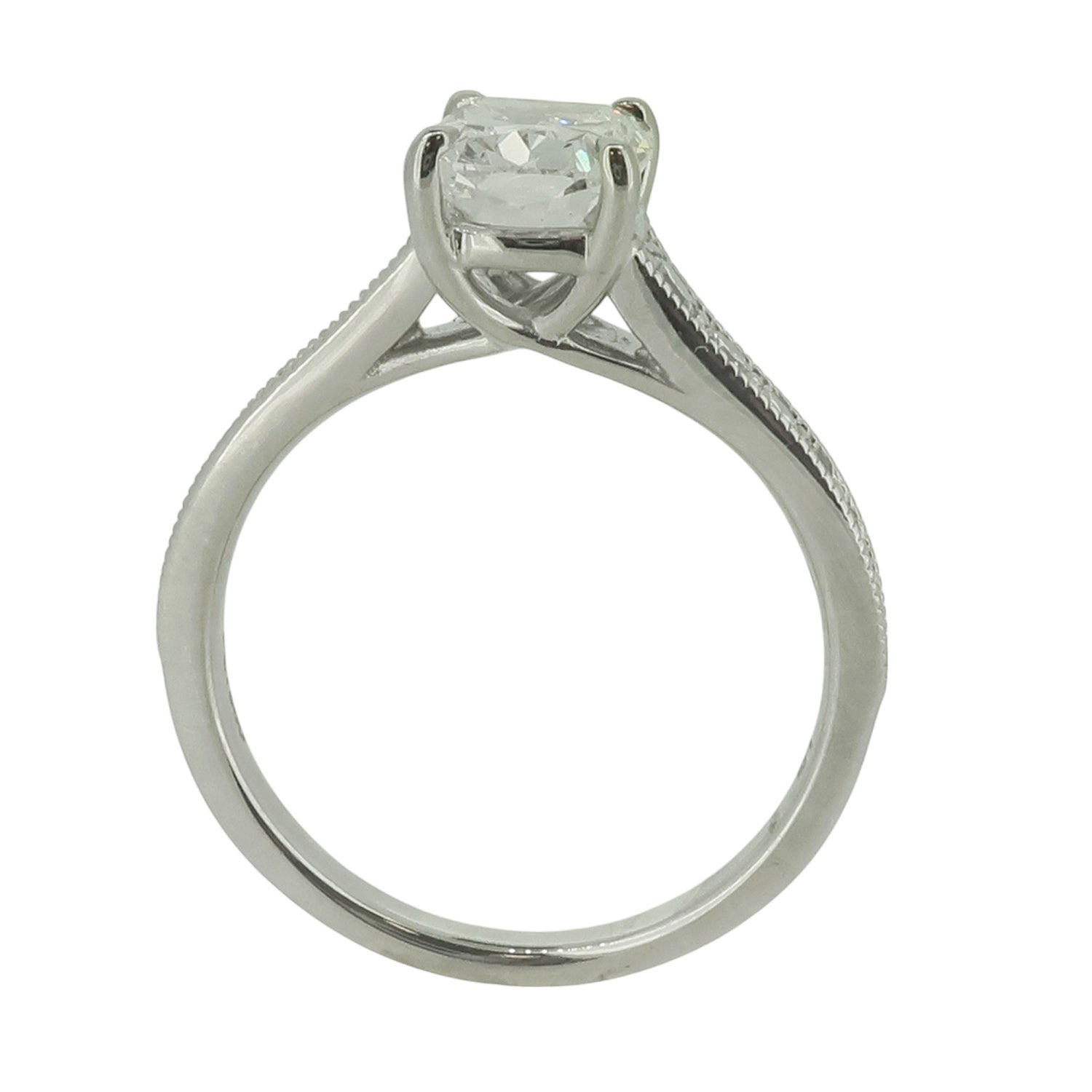 The elongated cushion cut gives you a squarer look without compromising on the sparkle. A four claw setting and brilliant cut diamond shoulders showcase plenty of diamond that is sure to catch the eye, with a beaded edge that gives it a classic look. The centre stone itself weighs 1.55ct and has been independently graded as D colour and VVS2 clarity, ensuring you can be sure of a bright and colourless appearance with no inclusions visible to the unaided eye. The ring is made in platinum which complements the white diamonds perfectly.