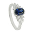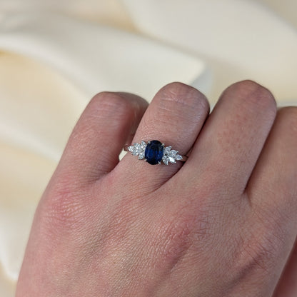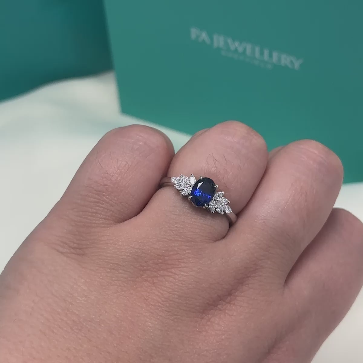 A beautiful sapphire and diamond ring, perfect if you are searching for something a little different from the typical three stones and clusters.  The oval sapphire has a rich, velvety blue hue, exactly as one would hope for from the gem.  It is accompanied by ten marquise shaped diamonds, their elegant, tapering outlines creating a lovely cluster with a foliate style.  The diamonds are icy white and full of sparkle.
