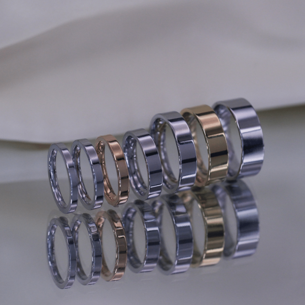 Flat on the outside and rounded inside for comfort. A sleek, modern look that sits close to the finger.