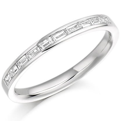 This classic channel set half eternity band is smooth and stylish in your choice of precious metals alongside beautiful baguette cut diamonds. The baguette cut offers a sharp and modern edge with striking flashes of light. In this piece the diamonds cover approximately 33% of the ring and the band is 2.4mm wide.