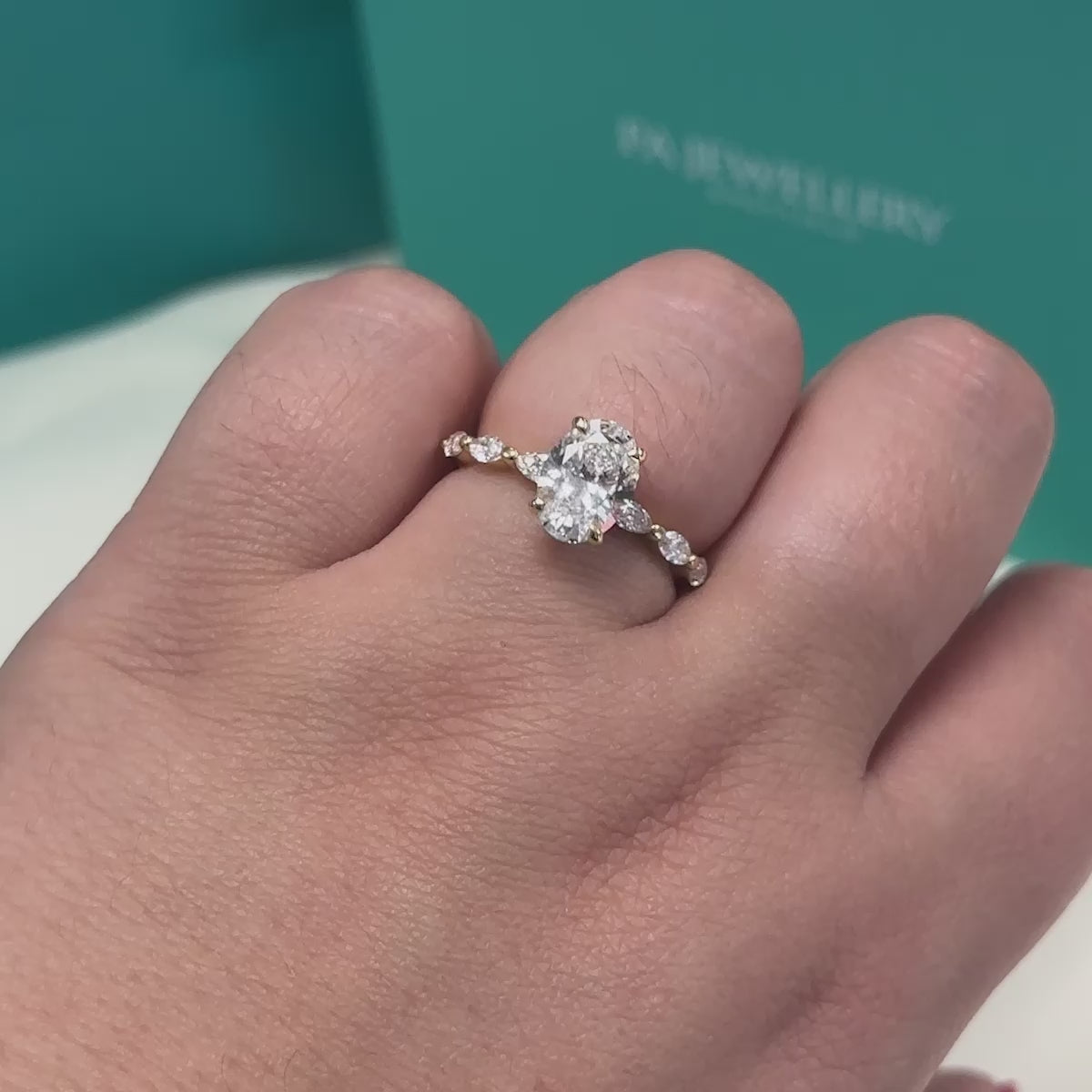 A laboratory grown 1.50ct oval cut diamond, with six marquise shape modified brilliant cut diamonds set into the shoulders. Combined shoulder stone weight 0.40ct