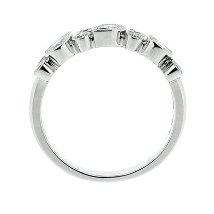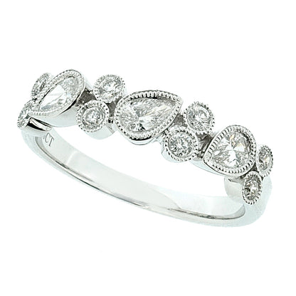A beautiful band design combining pear and brilliant cut diamonds to stunning effect.  Each of the three pear shape and eight brilliant cut stones is individually rubover set and finished with milgrain detail to produce a pretty vintage feel.  Crafted in platinum, this piece really stands out from the crowd and is a lovely ring for everyday wear.