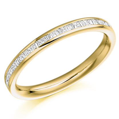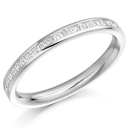A combination of princess and baguette cut diamonds bring a contemporary twist to this classic channel set half eternity ring.  The different shapes and faceting of the two cuts each give a slightly different sparkle with both also having sharp and square lines for a modern appearance.  Smooth and stylish, the channel setting is low and neat making it easier to sit next to another ring.  The diamonds cover approximately 50% of the ring and the band measures 2.4mm in width.