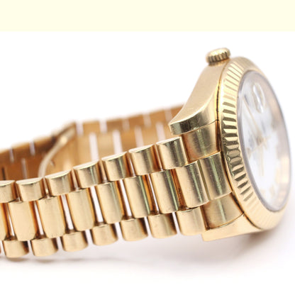 18ct gold case and bracelet, White dial and gold roman numeral dial markers.